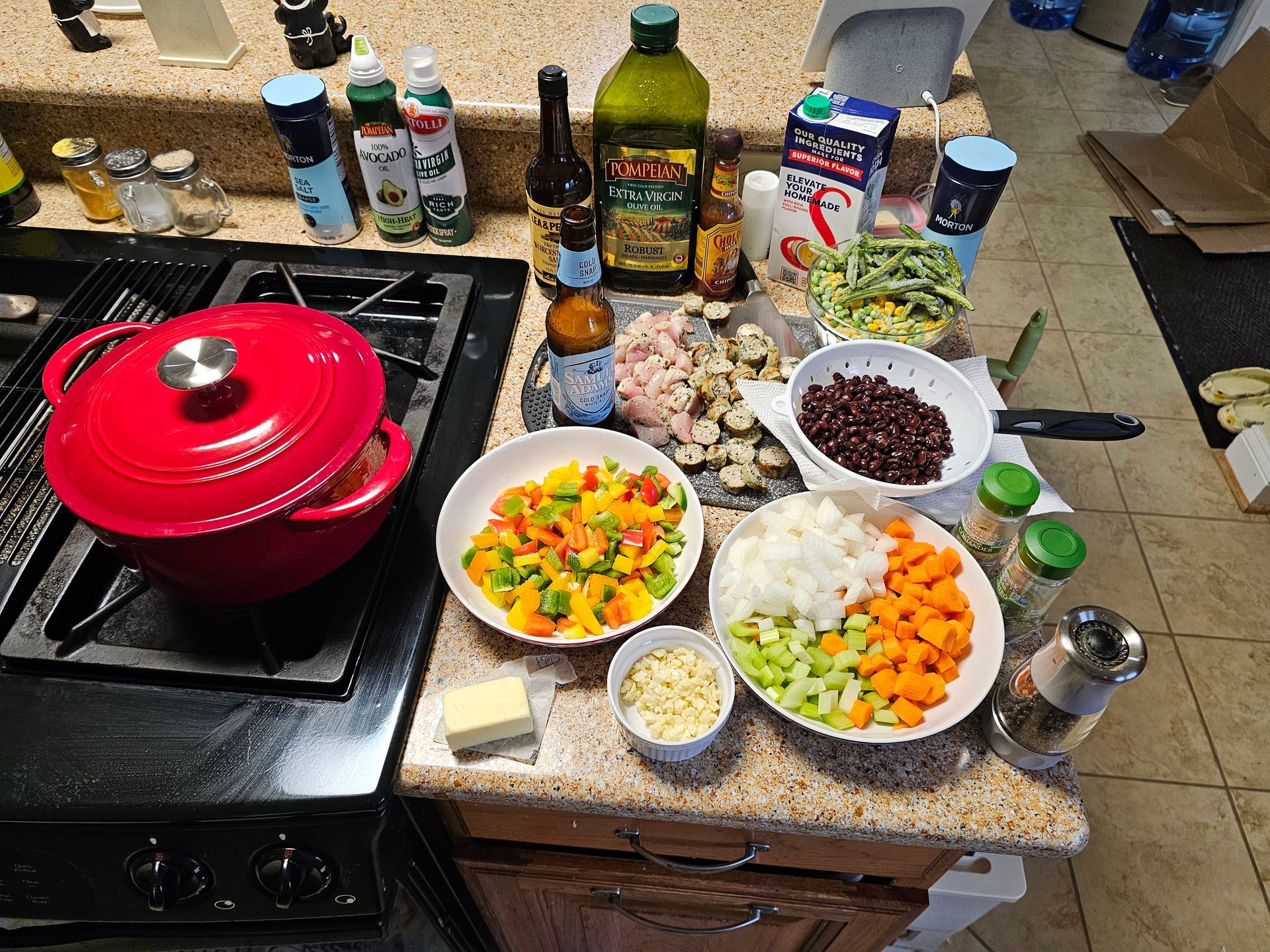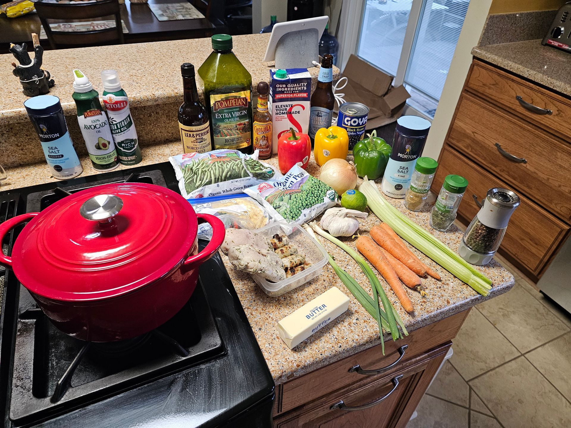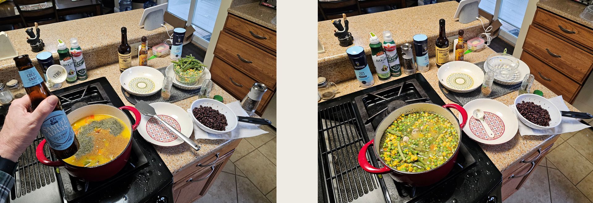 Once the Stock had cooked in a bit, I started adding the rest, a tablespoon of Worcestershire Sauce, maybe a tablespoon of Cholula Chipotle Hot Sauce, a tablespoon of Coriander, and Tablespoon of dried Cilantro (since I didn't have any fresh Cilantro to add in the bowl), I put it a dash of Sea Salt, probably a full tablespoon of fresh black pepper, did a taste test, it was missing "something", so I went ahead and put in about 1/2 a tablespoon of the Traeger Blackened Saskatchewan Rub (Garlic and Signature Spices) and, as Emeril Lagasse would say "BAMB!". Then I tossed in a cup or so of Frozen Corn, Peas, and Green Beans, as well as a can (drained and rinsed) of Goya Black Beans. I let this all cook over a medium fire for about 30 minutes or so.
