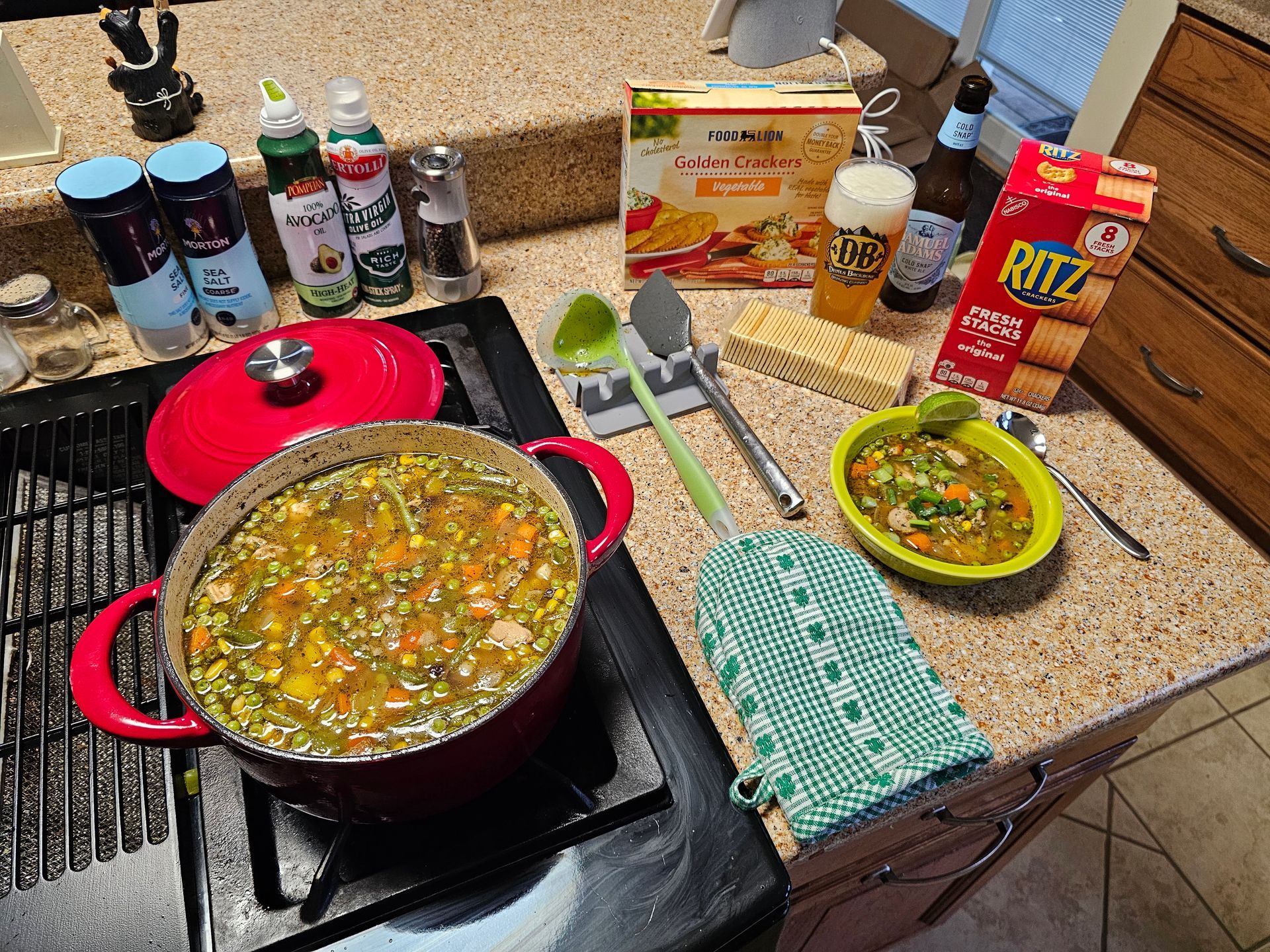 Delicious! Grab a fresh beer, pout that into a glass, and Serve the Soup up in a bowl with a wedge of lime and some Fresh Cilantro (if you have it handy), and of course some nice chopped green onions. It should pair very well with your favorite cracker, be it the Food Lion Vegetable Cracker, the always tasty Toll House Club Cracker (my choice today), or the wonder Ritz. Nothing beats a nice warm bowl of Homemade Soup on a cold rainy day.