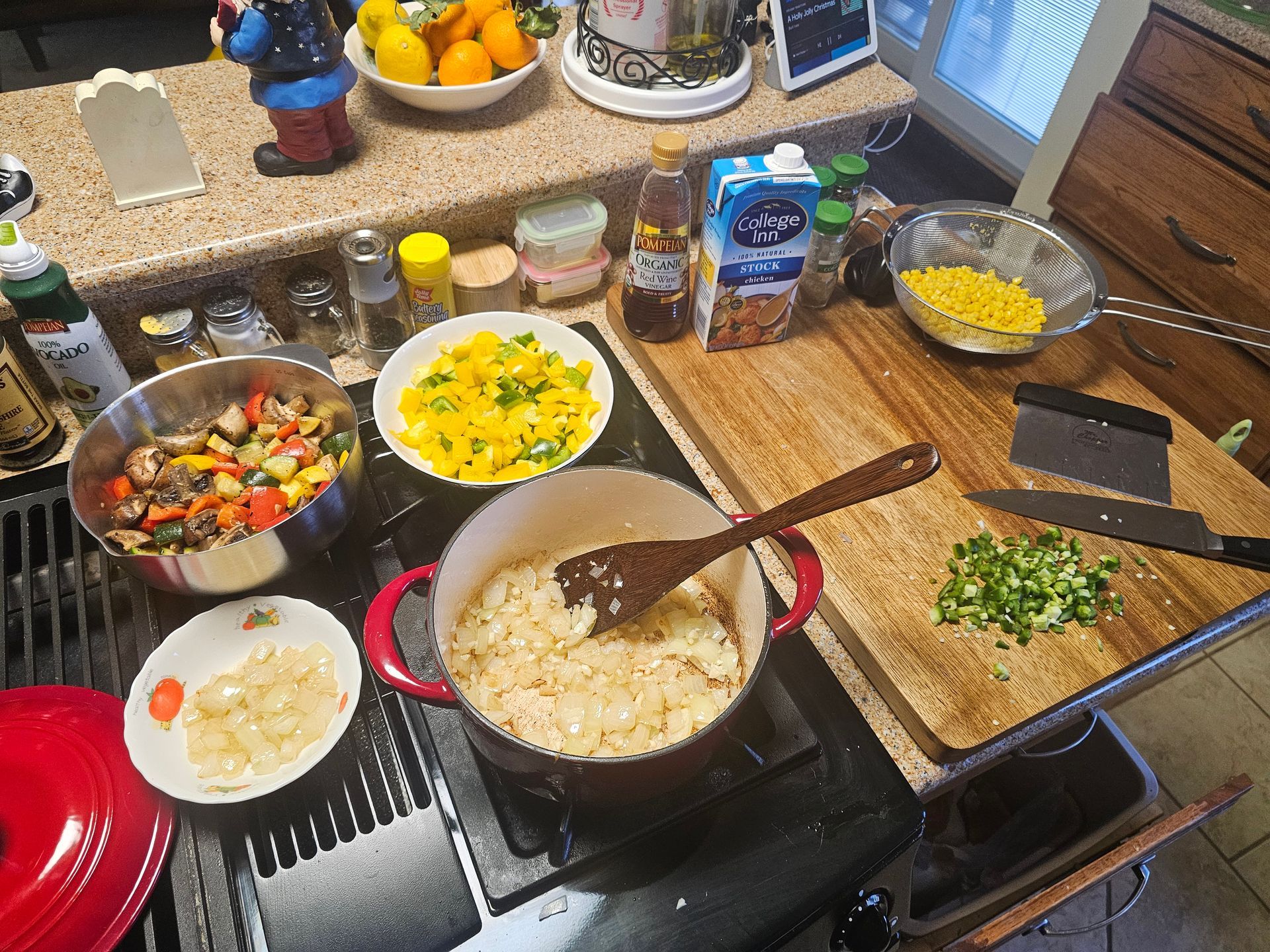 Of course I started with my standard "Mise en place" by getting everything cut, measured and prepared. Then I Sautéed up some Onion, saving a few out for later use and added in all the chopped Garlic until aromatic, I deglazed the pan with a splash of Red Wine Vinegar, at which time I added the diced Jalapeño (seeds and all, you can remove those for a little less spice, but I figured one Jalapeño wouldn't be very spicy in a pan this size) and just about half the other vegetables minus the corn and tomatoes.