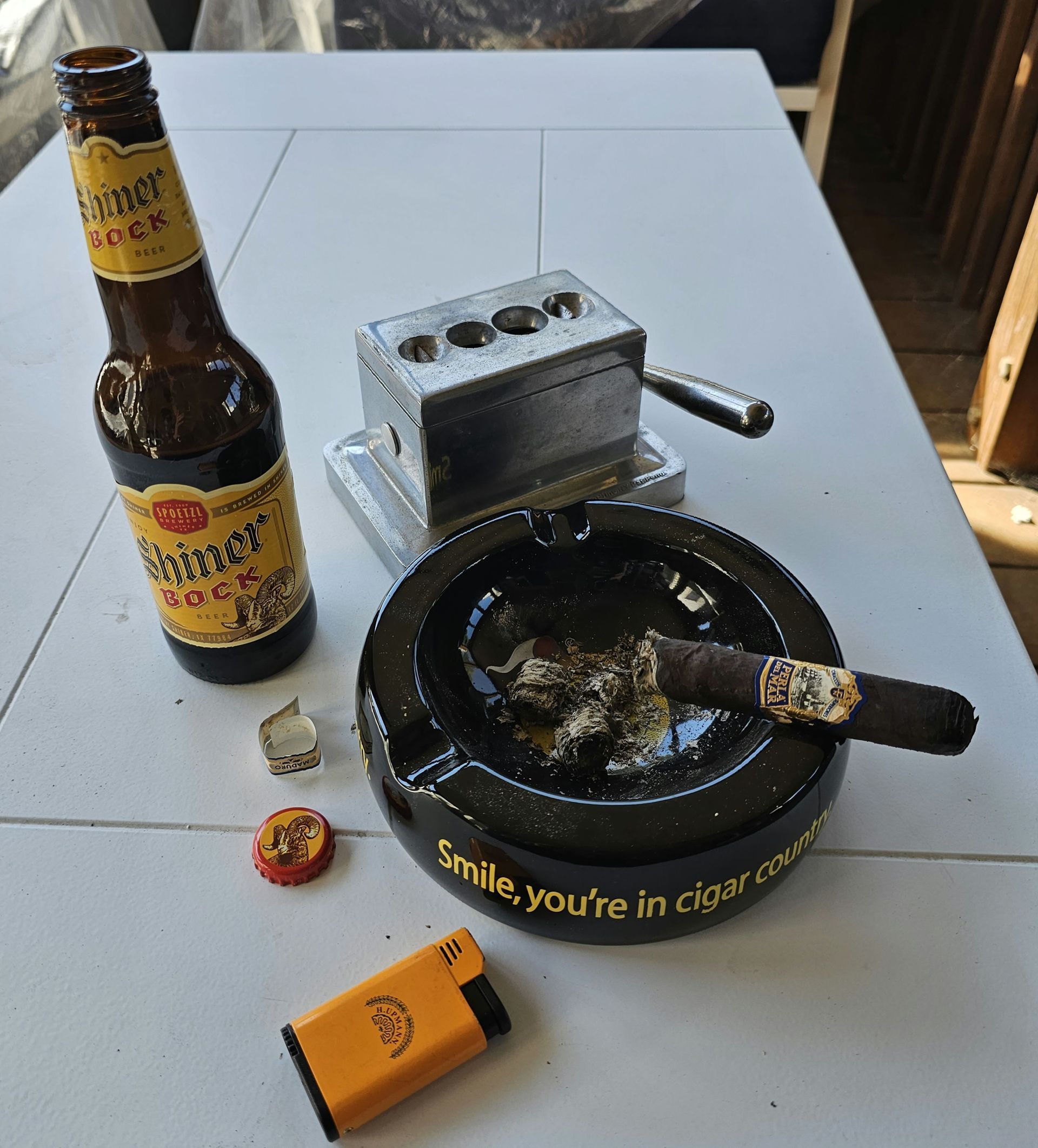 As I got closer to the center, I finished the Octoberfest and grabbed a Shiner Bock for the increase in depth of flavor I was hoping to get. The PDM flavor began to pick up, getting a little stronger, what a lot of reviewers seem to refer to as black pepper, oaky, deeper, it was getting better, and I was smart in my beer choice, another excellent decision. I was kicking back to Pandora AC/DC Radio and I can say, the music paired as well as the beer did ... ZZ Top, Johnny Cash, Zack Brown Band, The Steve Miller Band, Credence, and of course plenty of AC/DC, the perfect music for this deep dark cigar.