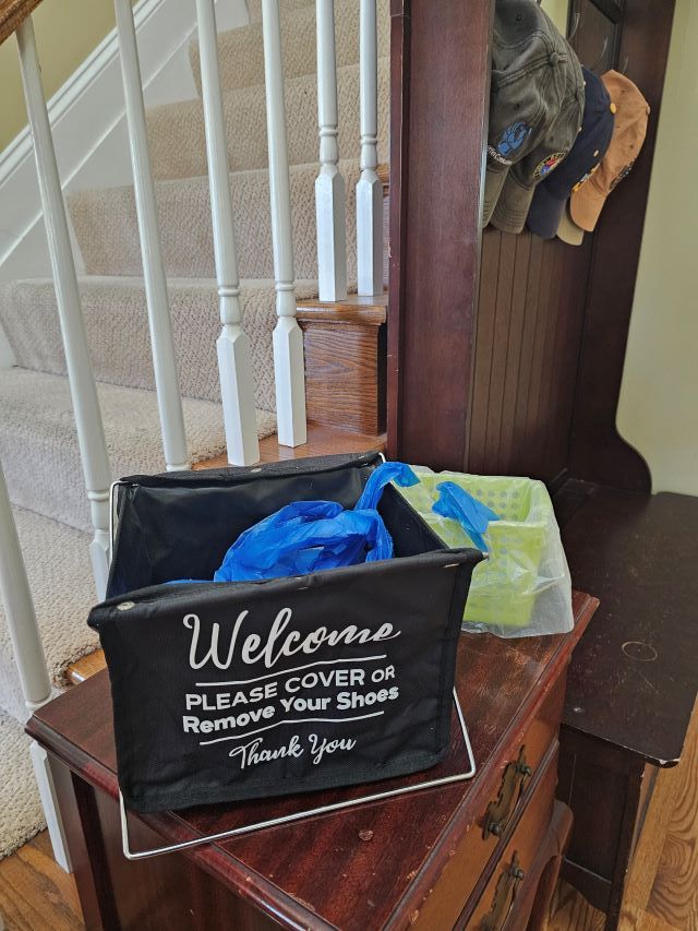 So, if you ever stop by Orbit City for a visit don't be surprised, shocked, or upset when you find yourself slipping out of your shoes and into some random disposable Spa slippers we've purchased for guests, or putting on a Shoe Condom from the Bin of Shame, it's become a Right of Passage, a Way of Life, a Fond part of Orbit City Living ...