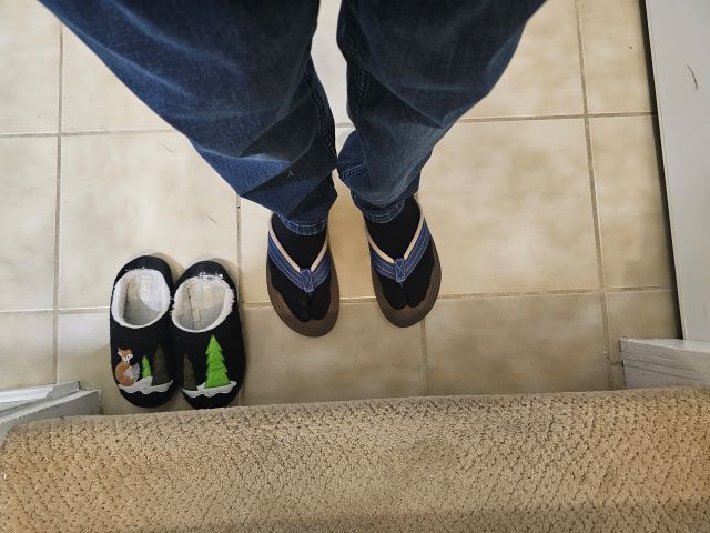 I still struggle to take off the upstairs slippers at the stair landing, travel down the carpeted stairs in my stocking feet, transfer to the downstairs sandals and reverse the process when I need to return from the Man Cave and reenter the Obit City Main Living Quarters. And whatever you do, don't think you can simply take off your shoes and step outside in your stocking feet, that has cost more than one visitor or contractor an eardrum (lol). What is the point of taking off your shoes if you are going to wear your socks outside and then bring the dirt in on them? and believe you me, many Americans struggle with this concept.